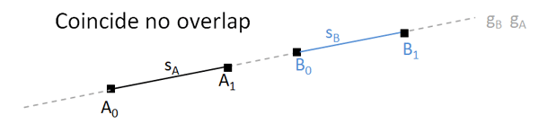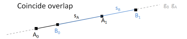 Both line segments are coincide but have no overlap at all, if neither s(B0) nor s(B1) are in range [0, 1].